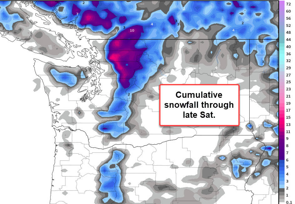 The good news is that snow levels will remain at 3000'. Later Saturday, more light snow showers. These snow totals through Saturday are reflected in the first map. Sunday, much of the area will be dry. However, chances of light snow for Crystal Mountain.
